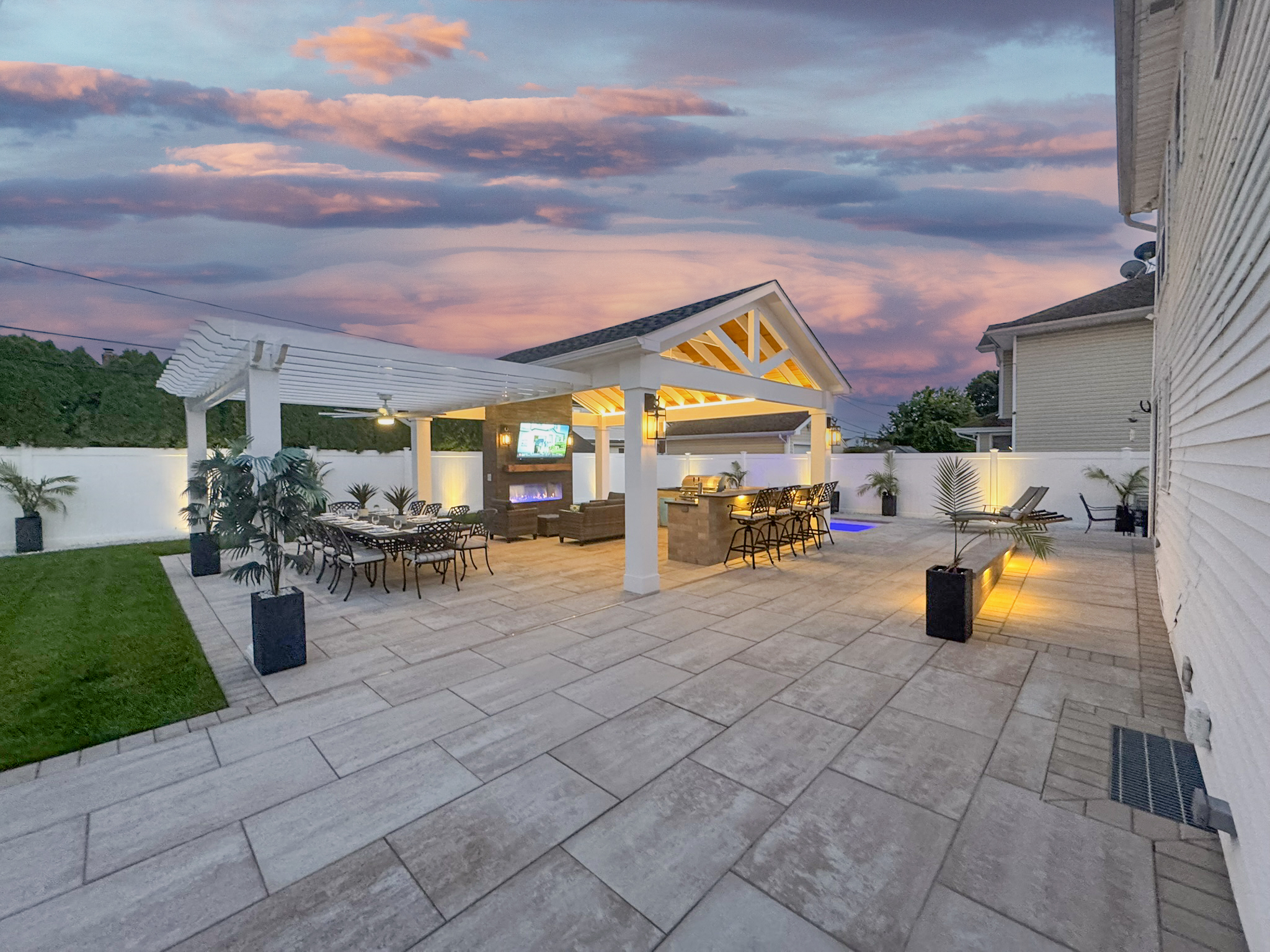 Maximizing the use of every inch of this backyard with an 8’x16’ cocktail pool (equipped with heater and LED lights), gas fireplace with natural stone veneer, and at the center a completely custom A frame pavilion. Inside you’ll find a natural tongue and groove open rafter ceiling, an outdoor kitchen fully equipped with Blaze appliances (grill, fridge, sink, trash draws, and kegerator), as well as a large flat screen tv and lighting throughout. Setting the stage for all of this is the 24”x36” sandstone light paver patio, pool coping, and custom ramp/stoop combo.