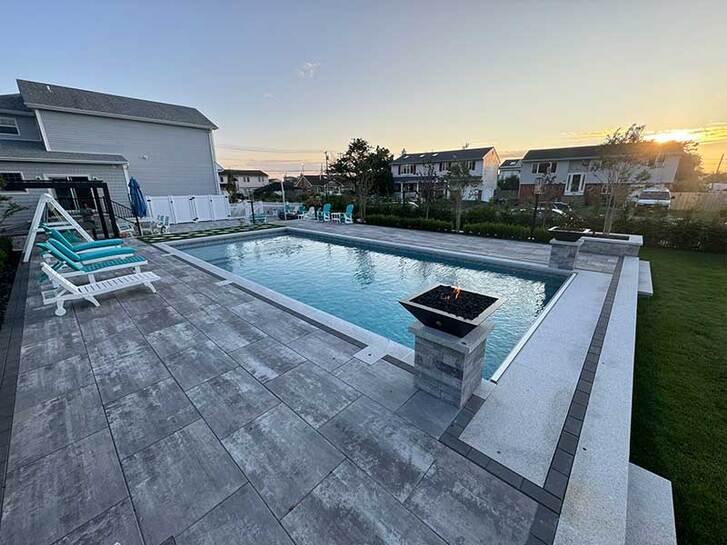 At Flawless Masonry, we recently completed a breathtaking backyard transformation in Lindenhurst, NY, blending luxury, functionality, and relaxation. The project features a newly constructed 18×40 concrete wall vinyl pool, outfitted with a heater, salt water generator, autocover, and LED lighting, creating a resort-like atmosphere. Surrounding the pool is a beautifully designed patio made from a combination of Cambridge 24×36 pavers, Ledgestone pavers, and natural stone granite. The pool coping and step treads, crafted from sandblasted white granite, provide a refined and timeless finish.