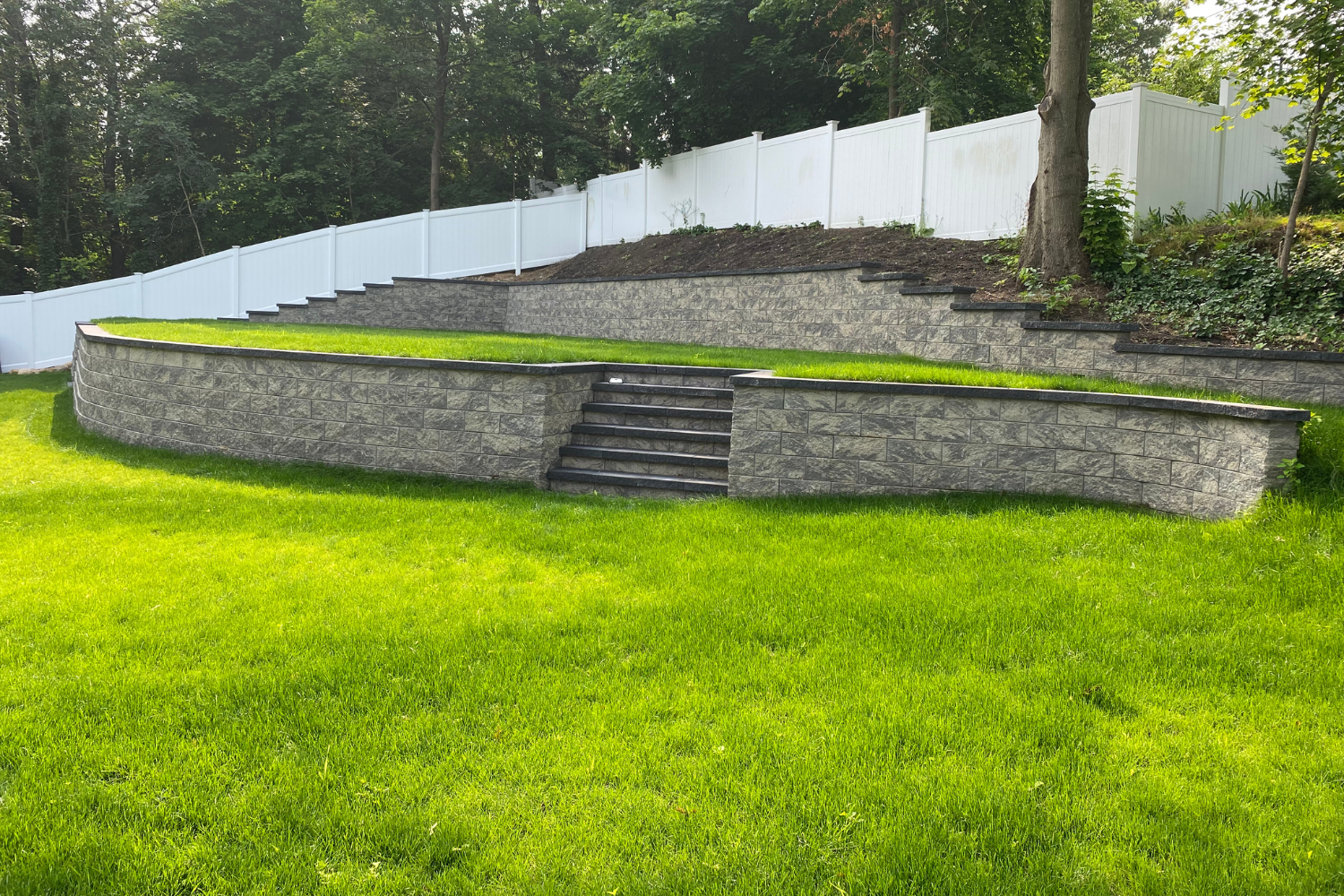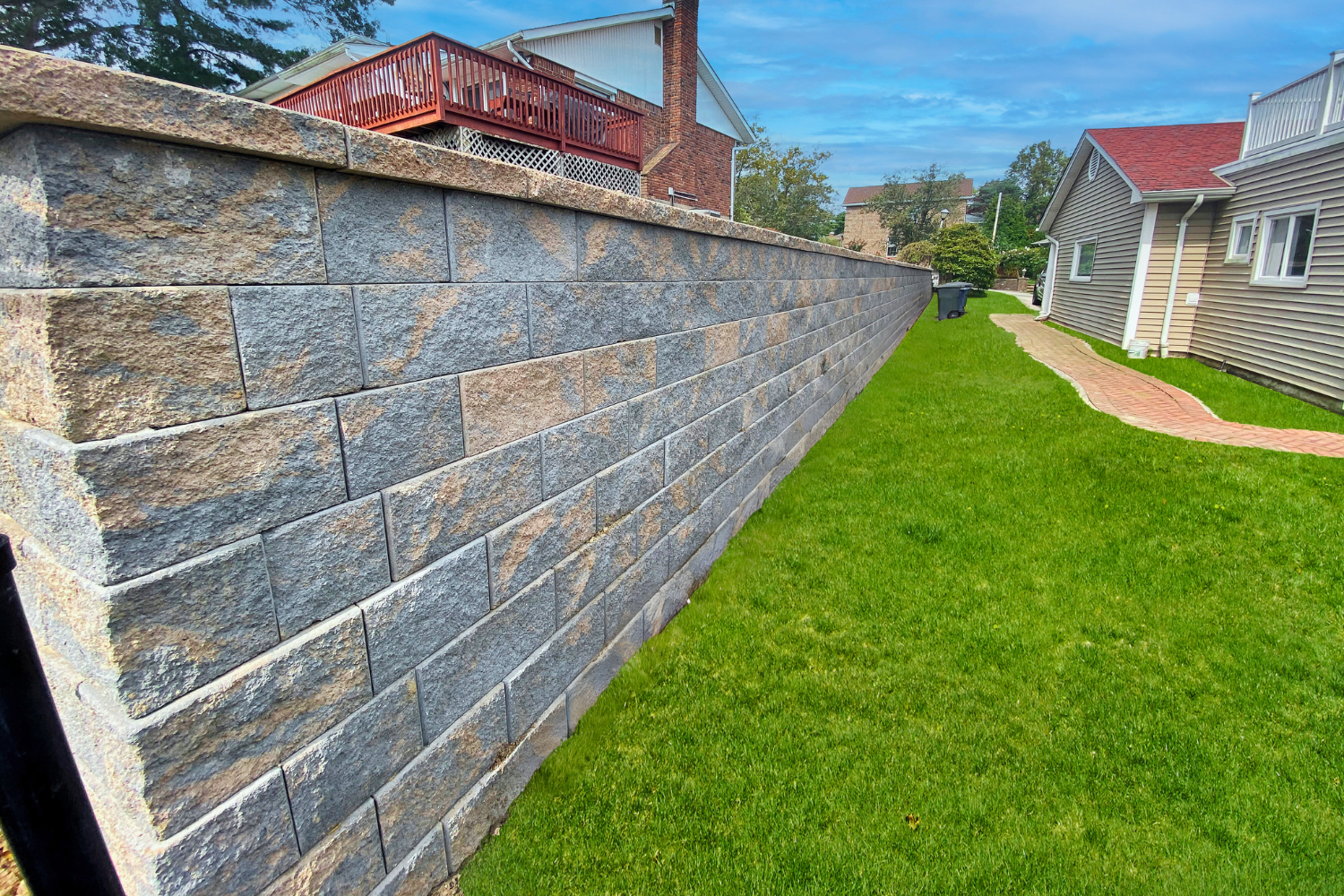 For structural walls, we follow strict guidelines and industry standards set by top engineers and architects. This includes incorporating built-in drainage systems, geo-grid reinforcements, landscape fabrics, and dead men, ensuring long-lasting stability.