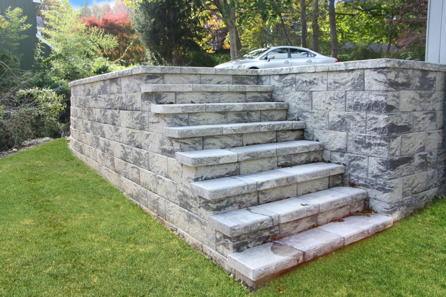 We use a variety of materials to build durable and aesthetically pleasing retaining walls, including wood railroad ties, stackable natural stone, concrete blocks with veneers, poured concrete, and interlocking retaining wall block systems. Over the past decade, interlocking block systems have become a popular choice due to their durability and versatility in design.